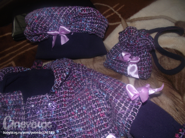 берет чуть большеват, но все равно смотрится очень мило! бантики на пальто я б убрала, а на сумочке и берете оставила))
