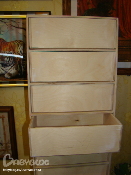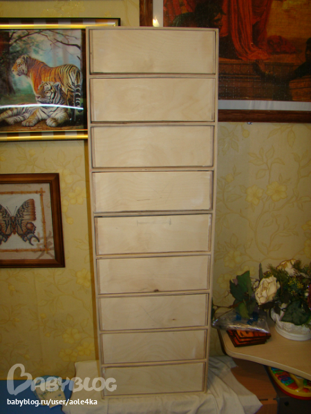 А это тот же комод в первозданном виде. Мой любимый муж выпиливал и собирал его сам. Столько сил вложил в него. Ведь там 9 ящиков, а их не вся любят делать в таком количестве.