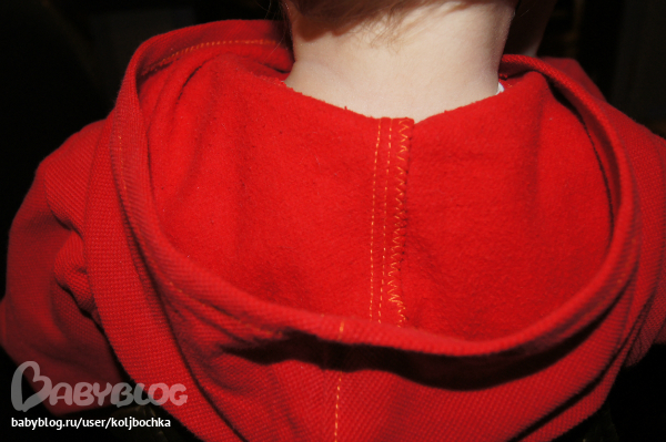 Я ещё не придумала что сделаю спереди для застёжки.Выкройку брала из Оттобре 2006/4 (у меня оттуда джинсы шились).Там 2 пуговки,я думаю сделать 1 пуговицу большую и белую.Не знаю...не посещает идея,что лучше сделать.Ещё хотела сделать в капюшон кулиску с белыми бубенцами на концах,не знаю как они называются,на толстых кофтах часто такие есть,но пока не до них.