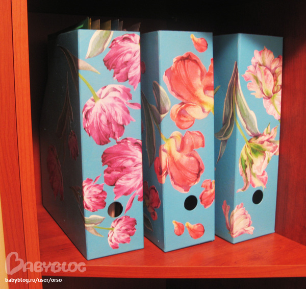 я использовала декупажную бумагу. Но и салфетки тоже годятся. А папки у нас продаются в канцелярском магазине, картонные. В Икее видела нечто подобное из дерева - наверное, это еще лучше.