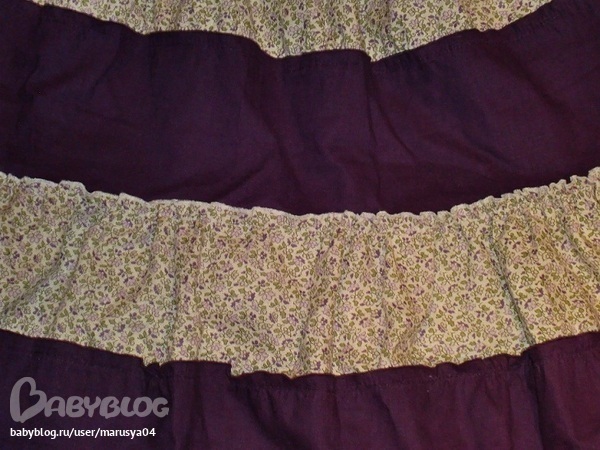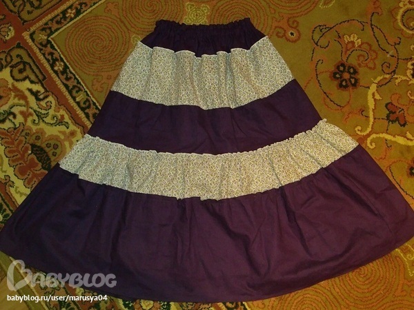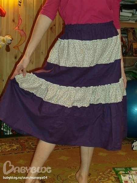 Да - вот фото - юбка не в пол, при желании можно сделать еще одну нижнюю полоску того же размера. Ткань - лен фиолетовый+мелкий цветочек фиолетовый - смотрится гармонично) И на мне - блузка не подобрана - зато юбка хорошо видна!!!!!