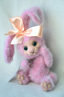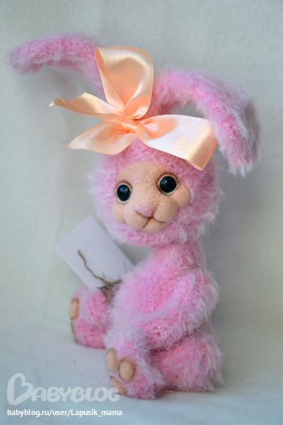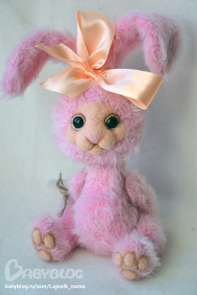 Милая, нежная и немного застенчивая зайка Роуз с большим бантом и таким же большим и добрым сердцем.Связана из фасонной пряжи, в пузике метал.гранулят, мордочка и лапки приваляны, шплинты. Рост 17см без ушей.