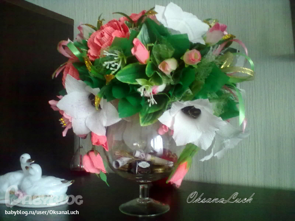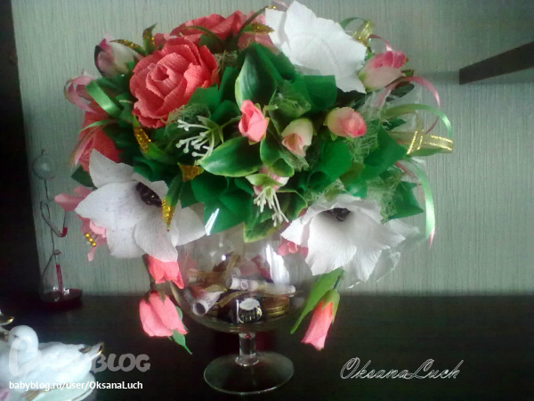 Оксан, твои букеты на стекле всегда супер! Я все любуюсь твоей вазой с розами, а тут новая красота. Очень понравилось как ты денежки упаковала. И подставка очень интересная. А внутри подставки поздравление? Только, мне кажется, конфеток ты для свекрови "пожадничала", в букете много искусственных (безконфетных) цветов. И хоть в целом букет это совсем не портит, но чайку будет попить несчем