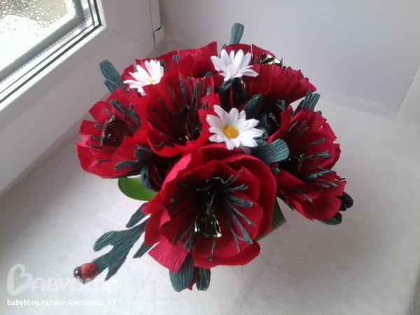 Симпатичненький букетик, только лепестки у маков угловатые, кидаются в глаза. Их бы округлить и тычинки действительно поменьше немного сделать.