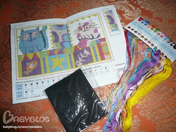 Писала, писала, а ответ куда-то пропал, ррр... Так, набор с кошелечками: канва очень плотная и гибкая, как прорезиненная, кнопочки-молния, схема вышивки, схема сборки, нитки, иглы. Вот: