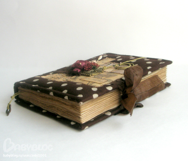 СкрапбукингС нуля, размер А6, 100 тонированых в кофе листов (некоторые со штампами), коптский переплёт, обложка ткань, закладка с подвеской .