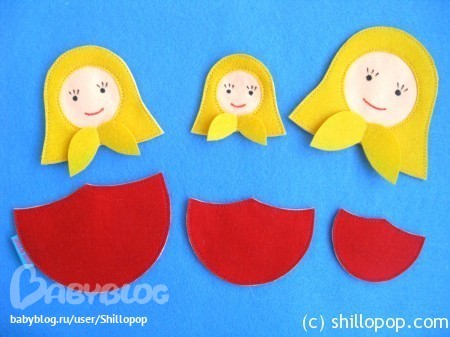 ФетрМатрешки из фетра - простая, но полезная игрушка для малышей. Три куклы с липучками для научат складывать картинки из двух частей, различать предметы по величине и считатать.