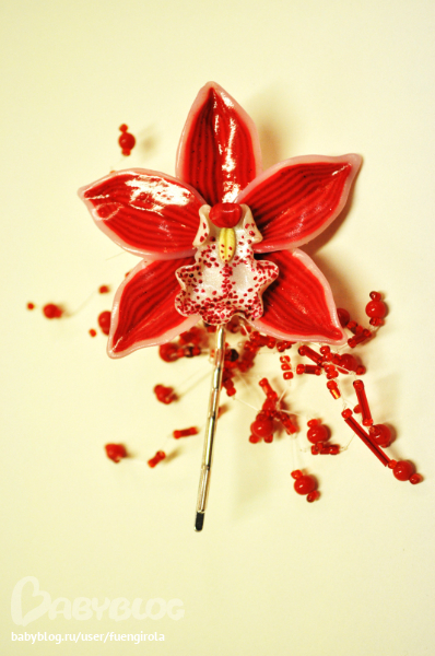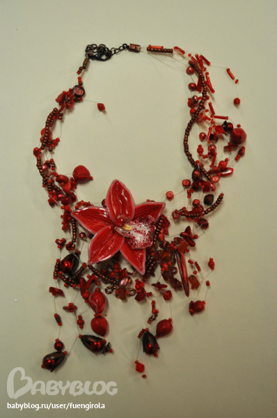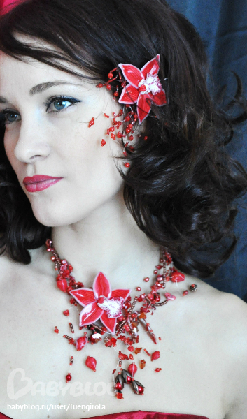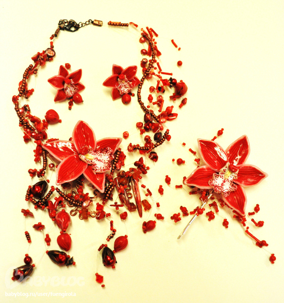 В материалах я исползую кроме ФИМО кристаллы сваровски, натуралные камни (кораллы,гранат, розовый кварц и мн.другое), речнои жемчуг, различный бисер, металлофурнитуру, чешское стекло...