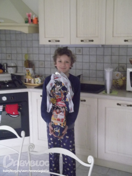 А это мой помощник. Как только проснулся, так прям в пижаме быстрей на кухню мне помогать. Шутка! Быстрей яйцо пасхальное шоколадное искать.
