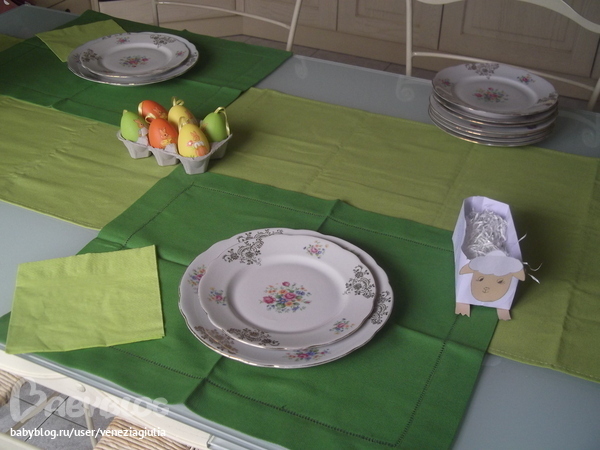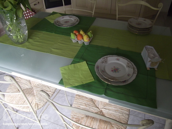 Это, так сказать, "проба пера". Пробую варианты для декорирования воскресного пасхального обеда (на 3 человека). Все очень просто. Цвета салатовый и зеленый + желтые тюльпаны (для придания весеннего настроения). Люблю желтые и белые тюльпаны. Тарелки очень простые в цветочек (такая же супница для бульона, салатница).
