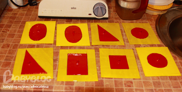 Из толстого картона (коробка из-под чайного сервиза, спасибо свекровь припасла для меня), вырезала прямоугольники, внутри них вырезала геометрические фигуры, все обклеила цветным скотчем, к фигуркам приклеила кнопки, подходящие по цвету, предварительно муж кусачками отломал у них стержни, тк клей попался не очень хороший, сверху еще раз аккуратно обклеила цветным скотчем!