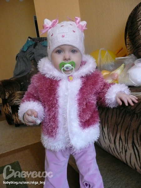 Никогда не нравились вещи из травки, но Ваша курточка - просто прелесть, такая милая, а в компании с красивой шапочкой получился чудесный наряд для маленькой красотки!