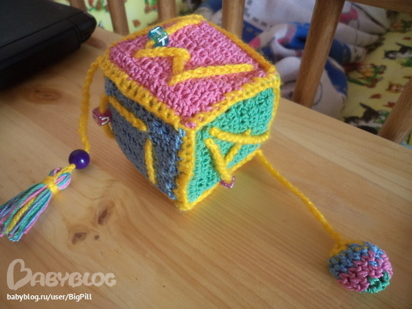 Вдохновил тоже пост чей-то))) Этот кубик МАМА-ПАПА для друзей связала, как приятно было вчера у слышать, что это любимая игрушка))) А свой чуть больше из разных граней цвет и нить разные, что то помягче, что-то поплотнее, я еще не дополнила украшениями, мы все равно пока им не интересуемся особо, только смотрим. Горошек тоже хочу)))