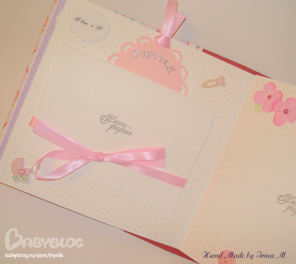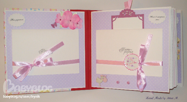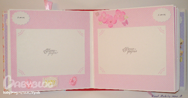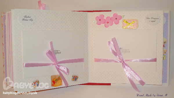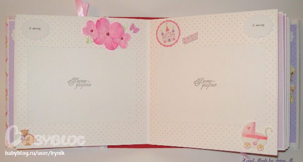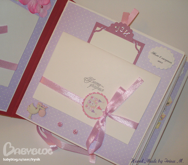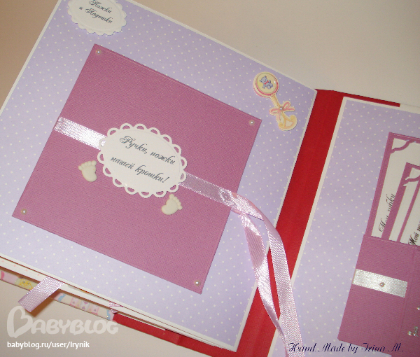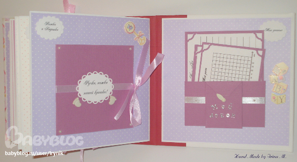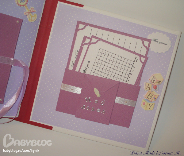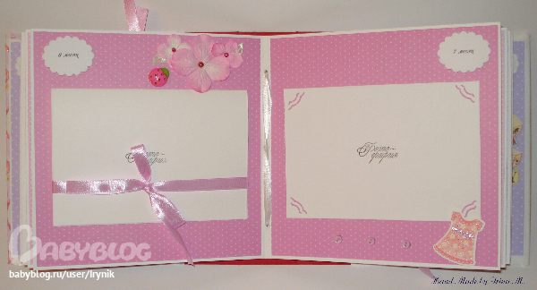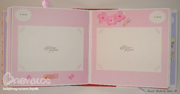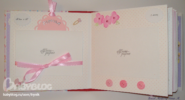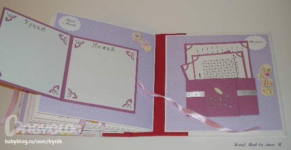 1 разворот посвящен Родителям малышки и её ожиданию. Под ленточками прячутся "гармошки" с дополнительным местом для фото. Есть кармашек для фото с УЗИ.