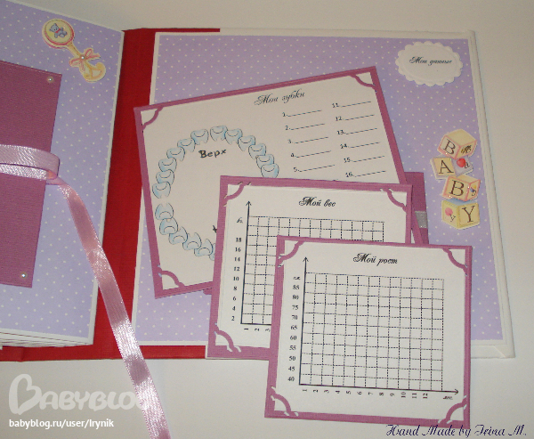 Кармашек с графиками роста и веса малышки, с зубками, а также маленький кармашек для первого локона малышки...