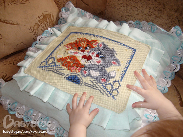 Шитье одежды, выкройки, ремонт одежды, шторы, швейные машины (уже приобретенные)Сидела вчера вечером без дела и увидела как дети схватили вышивку мою единственную, постиранную и поглаженную. Сердце ёкнуло и мысль пришла в голову, что ее нужно куда-нибудь пристроить пока она цела, так получилась подушка для Ксюшки.