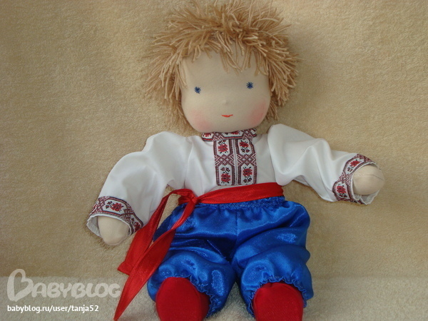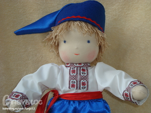 Заказали мальчика-блондина в национальном украинском костюме. Головной убор (не знаю, как назвать) муж раскритиковал, сказал, что нужна папаха. Кусочек каракуля есть, попробую сшить, а пока так