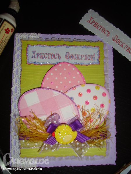 А мне кажется, остре края как раз лучше, они перекликаются с лентами и создают более целостный образ! И я б сделала надпись нежно-голубой, его не хватает для полнот пасхальной картины))