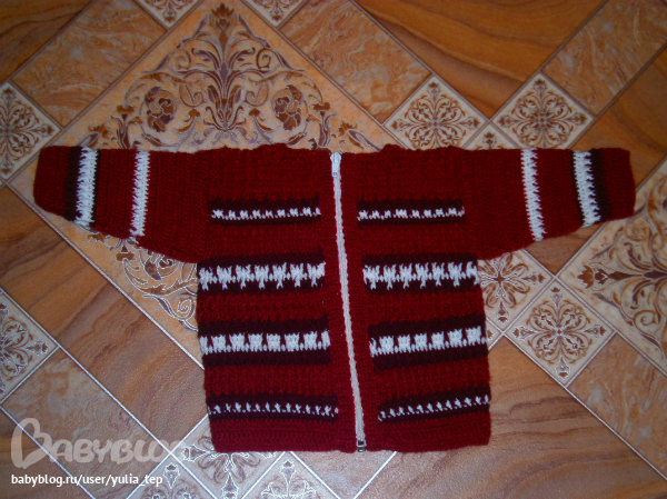 из остатков пряжи связала кофтенку. Когда пришивала планки для молнии немного скривила полоски. Ну, да ладно. Я сразу даже и не заметила. Мама говорит, что на девочку уже прям вяжу. А я думаю мелким все равно, если мальчик будет и ему пойдет))). Теперь хочу шапочку связать. Есть пряжа синяя)))