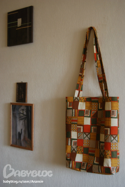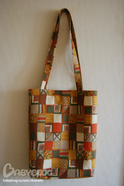 Ткань - американский хлопок, подкладка из икеевской небеленой ткани. Внутри один небольшой карман для сотового, сумка застегивается на липучку.