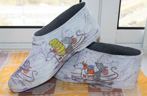 ДекупажОставалась одна салфетка с моими любимыми мышками и получился вот такой наборчик для дачи семьи брата. Подобные галоши делала уже в прошлом году - в них ставятся цветочки.