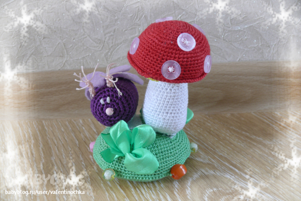 мошка мигает и тарахтит, полянка тарахтит и шелестит, грибок тоже шелестит чуток. Все отстегиваеться, гриб на кнопках, липучки к сожалению его не удержали, а мошка на липучке. Бусины все и пуговки хорошо пришыты, у меня дури не хватает их оторвать.