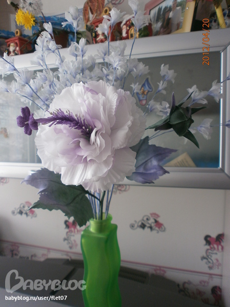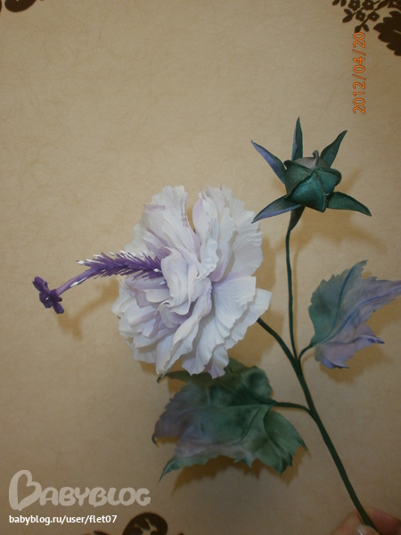 В последнее время делаю по мк с Юлей Федотовой букет Сиреневый дождь. Уже сделала мелкие веточки и один гибискус, всего их будет три. Гибискус какой-то интересный, похож на азиатский, может такой и есть, их так то от 200 до 300 видов. Еще его называют "сумасшедшей розой" (rosa loca).