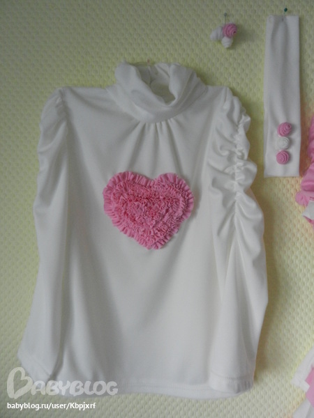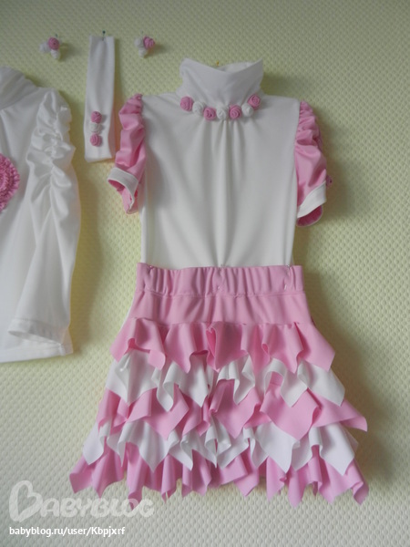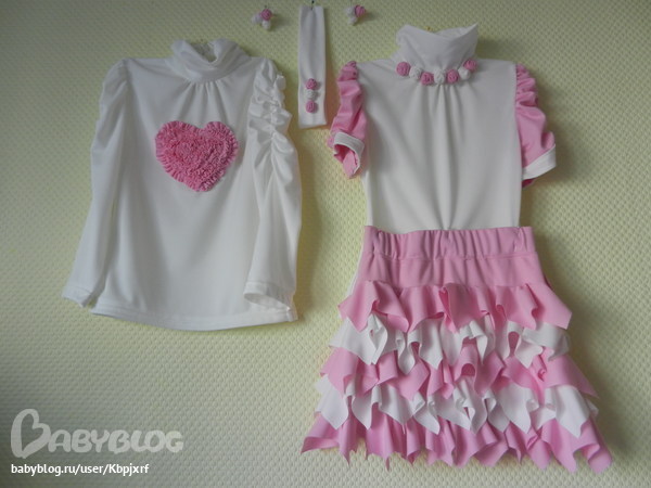 Комплект из трикотажа : водолазка с длинным рукавом,водолазка с коротким рукавом, юбочка с рюшами, повязка на волосы и две резиночки.