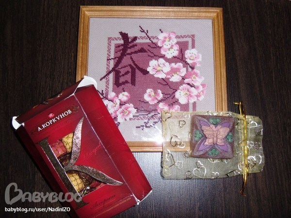 Ура, наконец то дошел. Еще раз извиняюсь за долгое ожидание. Я когда Ваш дневник почитала и увидела, что вы тоже вышивкой увлекаетесь, мне как то стыдновато было свою отправлять , очень уж она неудачно в рамку упакована, но я ж не подозревала, что кто-то когда-то обратную сторону увидит. Но решила оставить все как есть, так что, не судите строго... А конфетки, я гляжу, даже поролон не спас, печальный вид у коробочки...