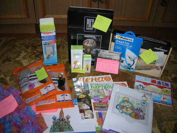 Дальше - набор для вышивки с часами! Не поверите, буквально пару дней назад заходила в наш местный рукодельный магаз и засматривалась на такие наборы и тут вуаля!!Еще кремчик, умывалочка!Ну и самое-самое, Леночка связала мне супер-яркий шарфик!