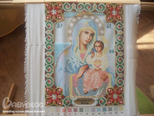 Ура! У меня это получилось! Я с фотиком! Вот и моя икона в процессе, с каждой бисеренкой она мне нравится все больше и больше. Вышиваю по фрагментам, потому что бисер золотой очень схож по оттенку, путаюсь. Пока занимаюсь фоном, он меня успокаивает.