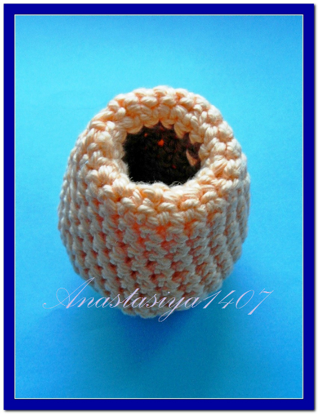 10 ряд: *2 сбн,убавка*4 (8).На этой стадии наполнить основу наполнителем, формируя пальцем отверстие для того, чтобы далеевставить туда связанный напальчник..Поменять нить.