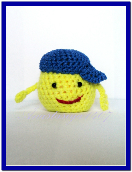 Я своему Колобку связала кепочку, но это может быть, например и панамка, или беретик.Вяжется так же как и туловище, но на пару петель больше.По мере вязания, примеряйте к голове.