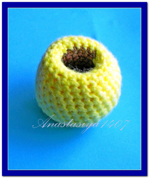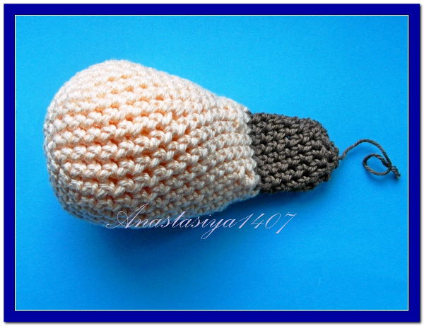 11 ряд: *2 сбн,убавка*4 (8).На этой стадии наполнить основу наполнителем, формируя пальцем отверстие для того, чтобы далеевставить туда связанный напальчник..Поменять нить.