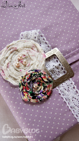 так, цветок делается довольно просто. вырезаю круг из любой ткани. по размеру будущего цветка- у меня флис. далее беру полоску ткани- у меня хлопок- шириной 1,5-2 см. завязываю узел и приклеиваю его по центру флиса. далее скручиваем полоску и по спирали приклеиваем к основе, крутим, клеим до нужного размера. кончик приклеила к обратной стороне флиса. затем клею на обложку и для верности еще прошила, чтоб наверняка) Надеюсь понятно объяснила)