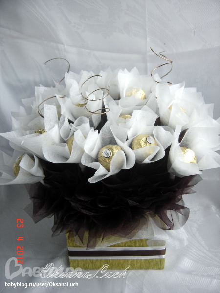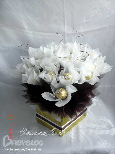 В оригинале и коробочка другая, я шпажки три раза переставляла. На такую коробку конфет должно было быть больше. Но мне сказали 31, значит 31. Органзой как могла добила. Но все равно прилично вышло.