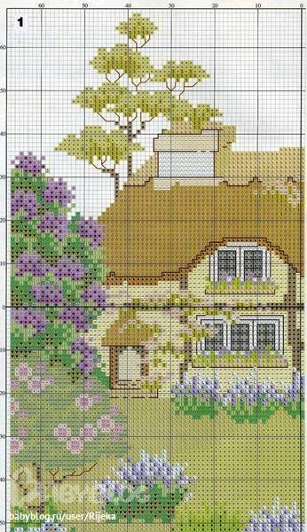 Домик вот такой (одну часть схемы поставлю) и как быть с подбором ниток-на глаз и собственное видение (к схеме прилагается ключ цветов)? И начиталась я про "в 1 нитку, в 2 нитки, в 3 нитки", про "полукрест и французские узелки". Поэтому прошу ваше мнение и советы. Буду признательна за любой комментарий, ведь слова проффи дорогого стоят.