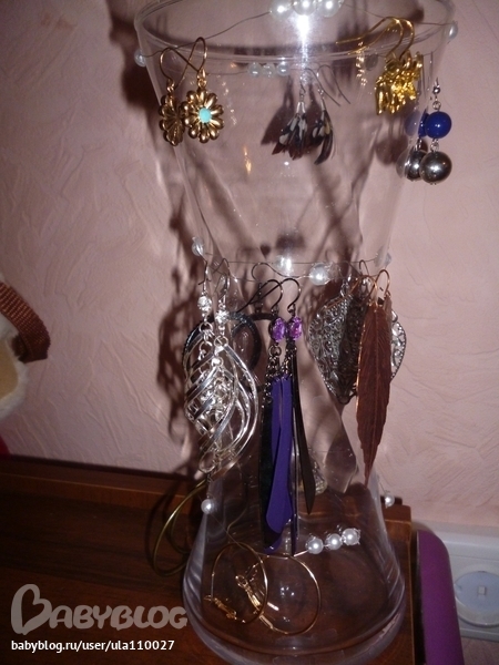 .а вазочка стояла так грустно и блекло,всё хотела её преобразить,и вот родилась такая идейка и вазочку украсить и серёжочки свои вывесить на светик белый.