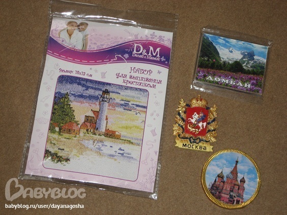 Катюша наборчиками для вышивания:)) Сегодня получила бандерольку) Ну и решили заодно обменяться магнитиками) И кстати, я подумала что это три магнитика))) хотела было прикрепить к холодильнику и поняла что третья-это шоколадная медаль