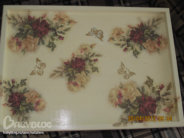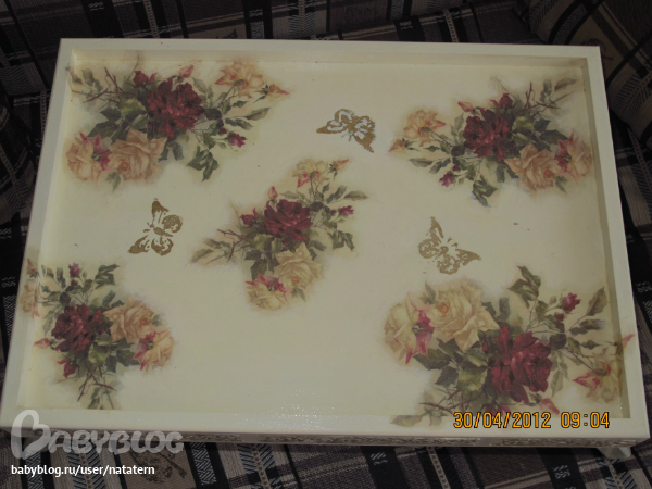 ДекупажКто-то любит кофе в постель, а я люблю после тяжелого трудового дня протануть ноги на диване напротив телевизора и попить чаю с вкусненьким...теперь это для меня не мечта, а реальность! Хотелось чего-то светлого ипозитивного. ВОТ и наваяла. Конечно,опять есть косяки,зато я попробовала что такое поталь и трафарет, и получилось так бАгАто )))))