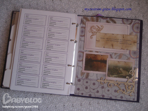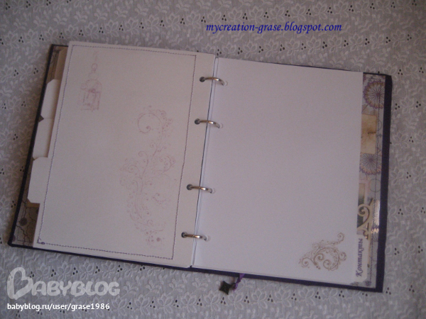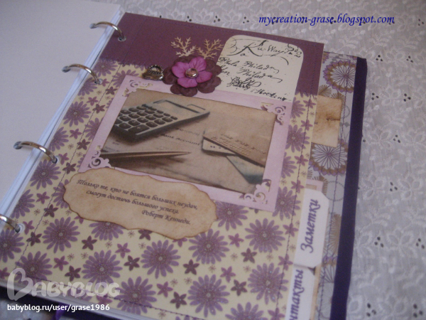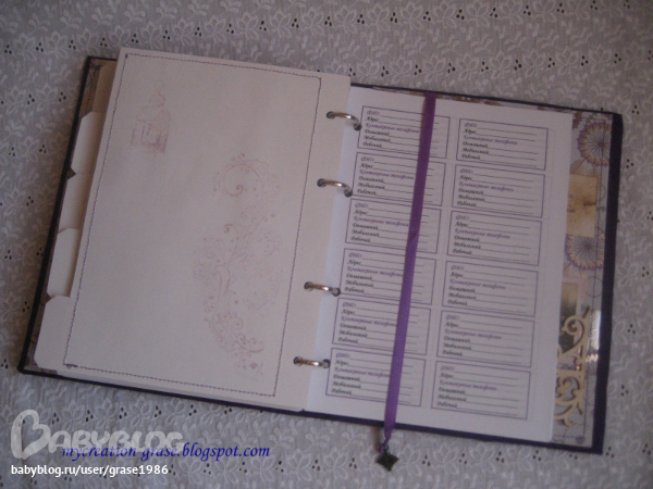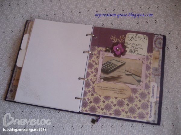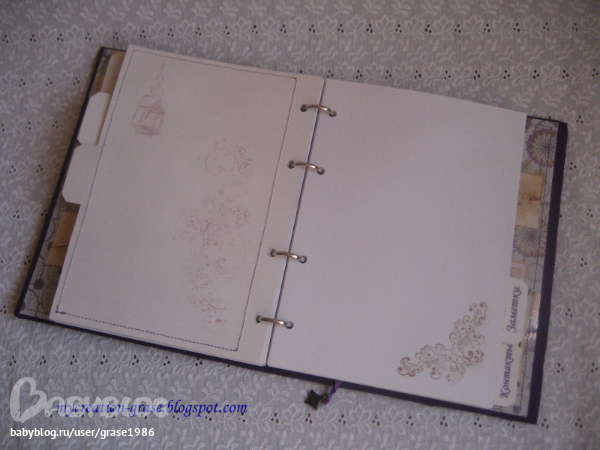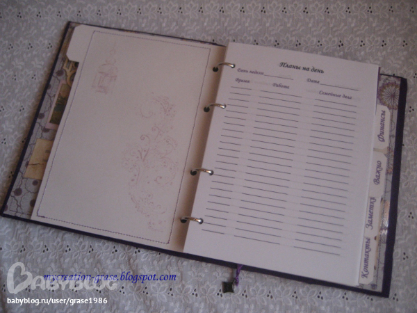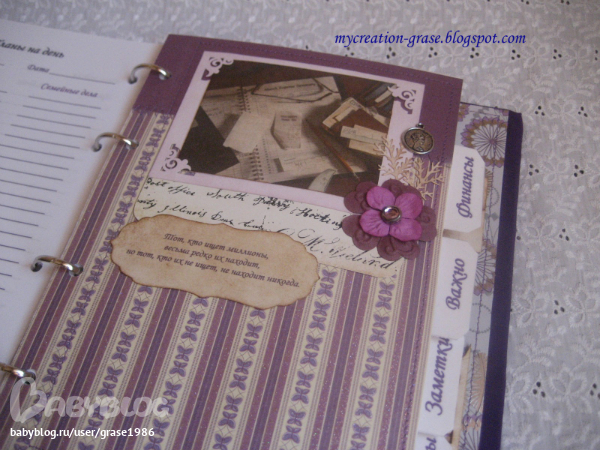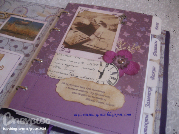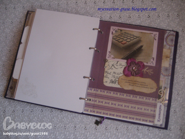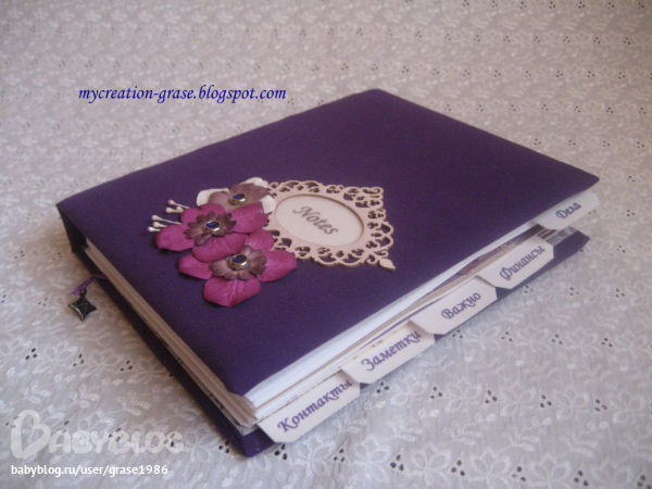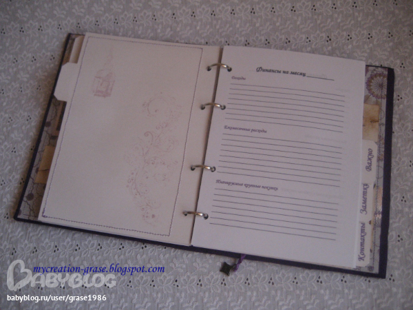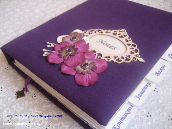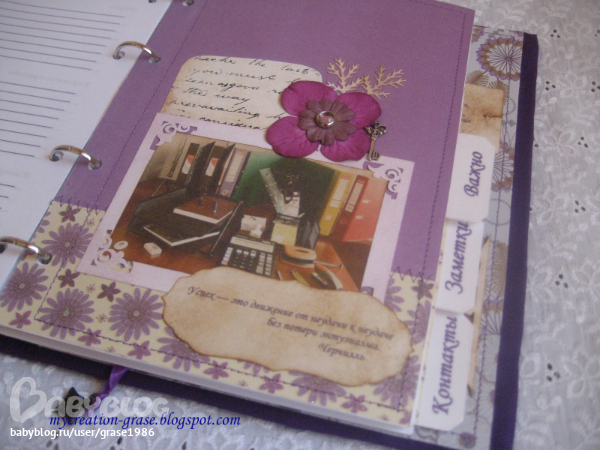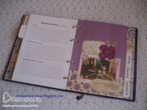 А дальше о самой работе: органайзер размером 22х17, в коробочке, пять разделов (Дела, Финансы, Важно, Заметки, Контакты), два кармашка для мелочей на форзацах, язык - русский, мякгая тканевая обложка. Пожеланием Вики было использование сиреневых тонов, что и постаралась исполнить:).