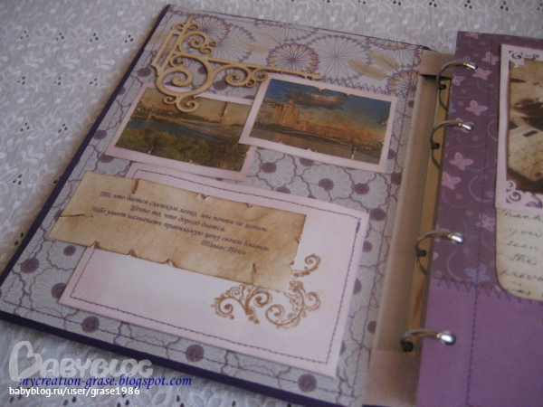 На первом форзаце - кармашек для мелочей, высечка, тонированная Дистрессами, кармашек тоже тонирован и штампик на нем маленький (как-то он хорошо высечку дополняет, на мой взгляд). На фото - Москва и Пенза