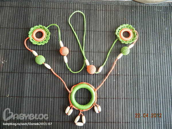 Бижутерия для слингомам. Слингобусы. Грызунки.Мои первые слингобусики)))) Такое сочетания цветов увидела здесь, у девочки (простите, не помню у кого), и поразилась: как ярко и позитивно! Причем, раньше никогда бы не подумала, что зеленый+оранжевый - такое классное сочетание)))). В общем, висят они у нас в прогулочной маленькой колясочке и на улице мы их с удовольствием их грызем))))