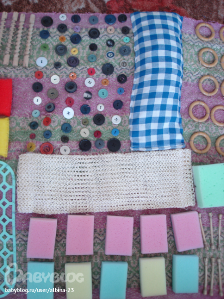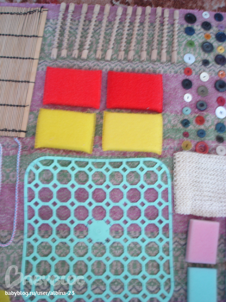 Далее-поролоновые губки,мочалка из сезали,пуговицы разных размеров и мешочек со шкорлупой от фисташек.