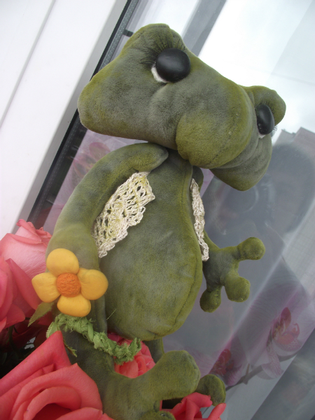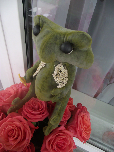 Квакуша сшита по авторской выкройке, из мягкого, бархатистого материала, тонирована акриловыми красками по ткани, глазки вылеплены мной из пластики, цветочек тоже из пластики, а жилеточка связана крючком!