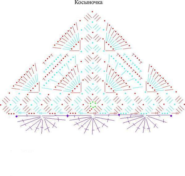 То что я дорисовала сиреневым - это и есть моя обвязка, там где точки - это места "крепления веера". Точно не скажу сколько накидов делала в столбиках (косыночки все пристроила, не помню).