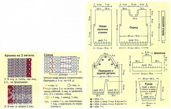 в изн. р. 14 п. = 88 п. и вязать узором по схеме. На высоте 7 см от жемч узора закрыть с обеих сторон по 30 п., центральные 28 п. связать еще 8 см и закрыть все п. Для нижней бейки на спицы набрать 9 п. и вязать след. образом: кромка из 2 п., 5 п. резинка, начиная 1 изн., кромка из 2 п. На высоте 25 см закрыть все п.
