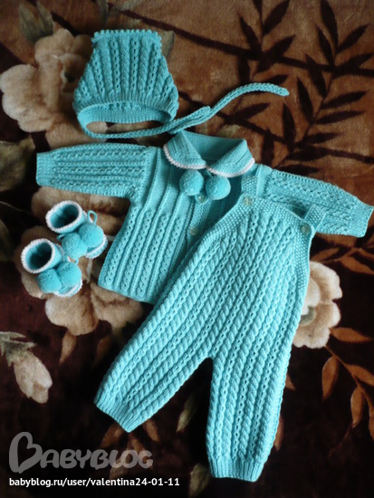 Выполнить швы и вшить рукава в проймы. По краю выреза горловины на спицы № 2,5 поднять 78 п., связать 3 р. жемч. узором, 2 р. двойной резинкой и закрыть все п. с помощью иглы. На одной из планок застежки полочек спинки выполнить 5 отверстий для пуговиц (обметать 1 п.), пришить пуговицы и воротничок. Готовое изделие увлажнить и просушить.