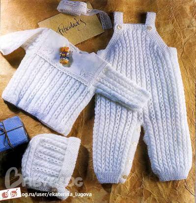Выполнить боковые швы. По шаговому шву каждой детали на спицы № 2,5 поднять по 105 п., связать 5 р. резинкой и закрыть все п. по рисунку. На планке застежки передней детали в 3-м р. выполнить 9 отверстий для пуговиц (2 п. вместе, 1 накид). На каждой бретели выполнить по 1 отверстию для пуговиц (обметать 1 п.). Пришить пуговицы. Готовое изделие увлажнить и просушить.