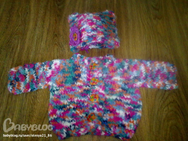 И костюмчик: котошапка и кофточка))) На ощупь они плюююшевые, очень приятные и яркие. Фото не очень получилось... комплектик приколюшный вообще! Будем потом с джинсиками его носить)))